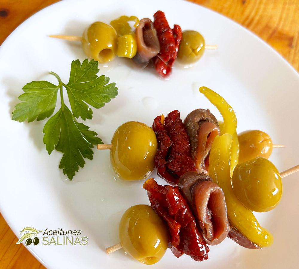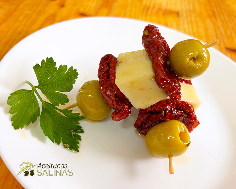 Entre nuestra amplia variedad de gourmets, sin duda nuestro pincho de encurtidos con tomate seco y queso es uno de los platos mejor valorados por nuestros clientes. Para su elaboración hemos seleccionado grandes aceitunas de la variedad Gordal que rellenamos de un delicioso tomate seco y un cremoso queso. Acompañada de la aceituna Manzanilla rellena de sabroso pimiento le sigue un pepinillo troceado que junto a la cebollita aportan la textura crujiente al combinado. Sin duda es un producto estrella por su originalidad y mezcla perfecta de sabores y texturas.