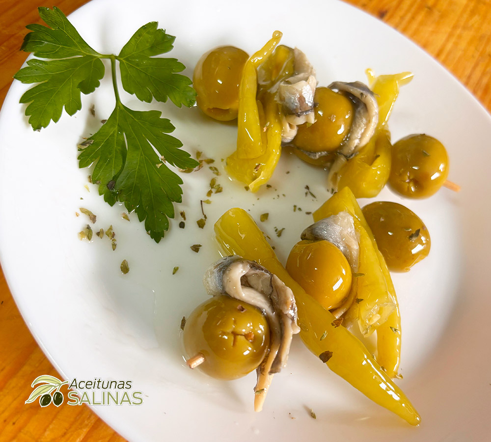 Pincho o Gilda de Boquerón fresco, piparra crujiente y oliva que redondea.