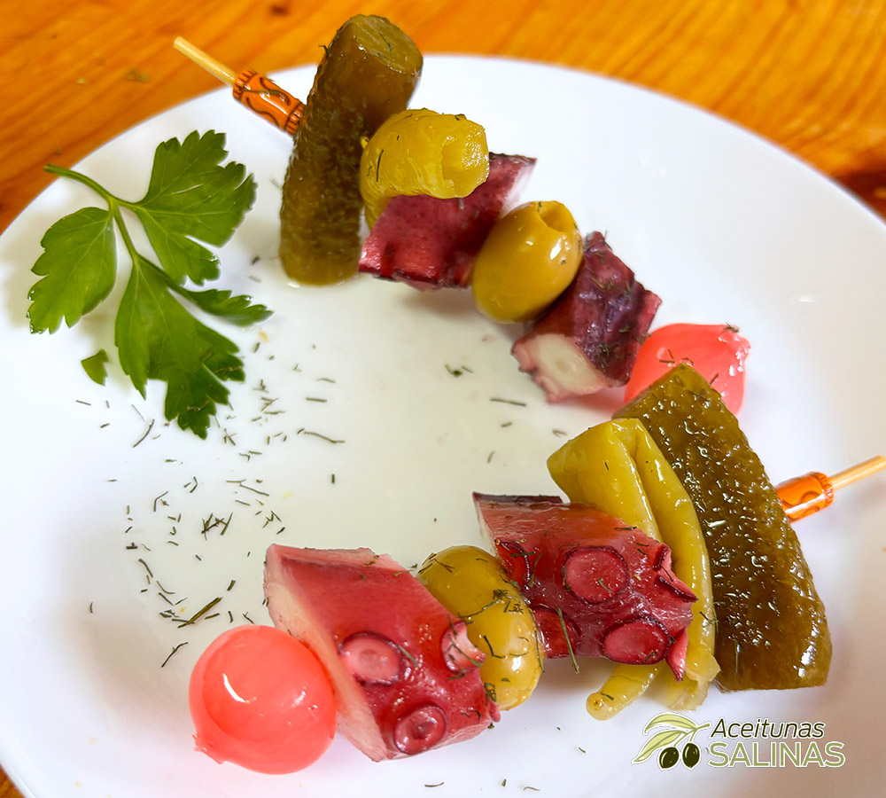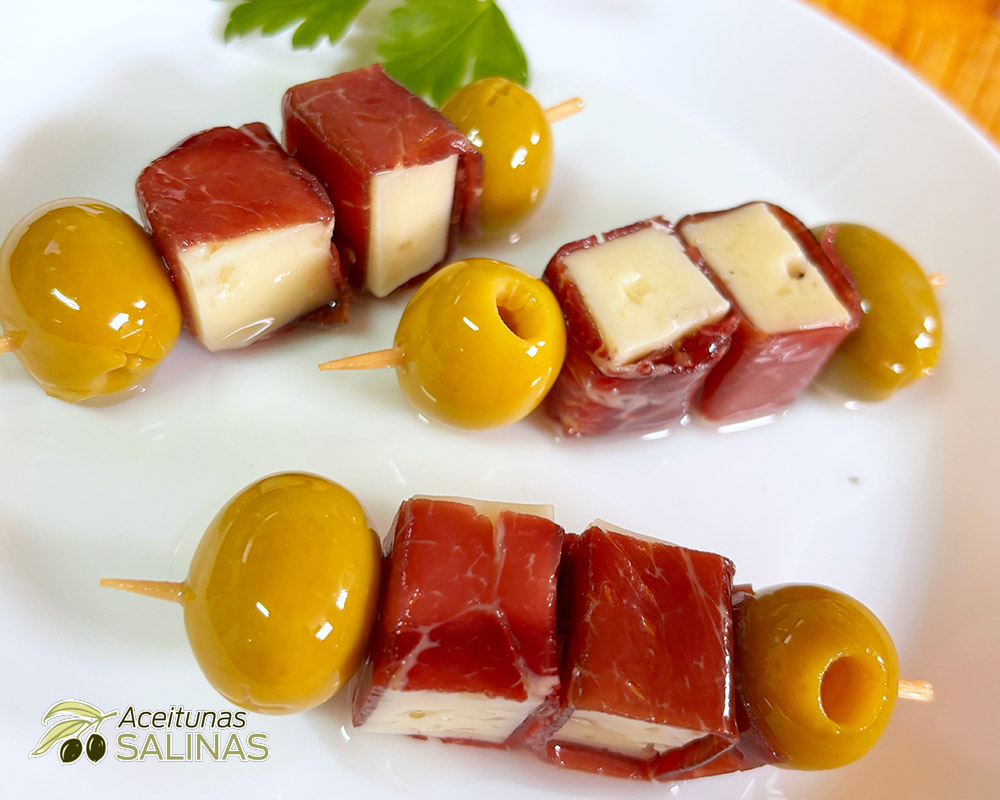De entre nuestros platos gourmet, esta combinación de colores, sabores y texturas no dejará indiferente a ninguno de tus invitados. La gran aceituna Gordal abraza un delicioso bocado de lomo con queso que despertará tus cinco sentidos. Estos productos han sido seleccionados para estar a la altura de un Pincho con el que sorprender durante el aperitivo. Desde nuestra cebollita al pepinillo troceado, pasando por la aceituna Manzanilla rellena de pimiento hasta llegar a la exagerada Gordal rellena, tu paladar experimentará un festival de sensaciones que no olvidarás.