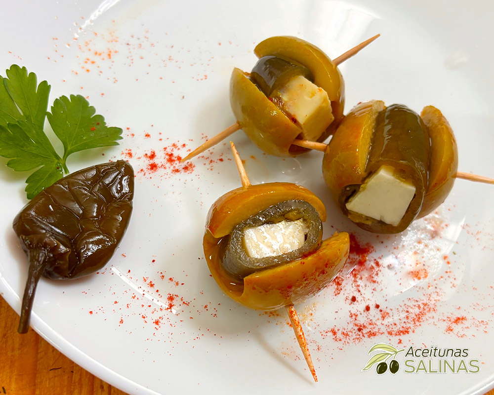 Pincho de Aceituna gordal rellena de queso y jalapeño.