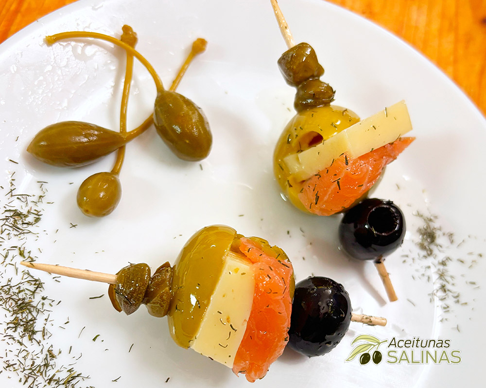 Pincho de Aceituna gordal rellena de Salmón y queso, acompañado de Alcaparra y Perla negra sin hueso. Riquísima.